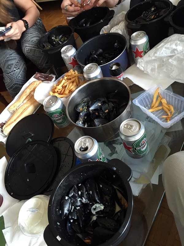 Évidemment on n’était pas tous d’accord sur quoi prendre à la place des spécialités italiennes, puis on s’est rappelé que l’Italie avait gagné face à la Belgique, mangeons belge pour les soutenir ! Moule-frites c’est sympa et ça plait à tout le monde, mais est-ce qu’ils livrent ? Eh bien oui, on a trouvé via l’appli Foodora bien connue des parisiens !